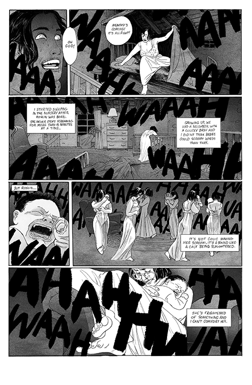 Inspired by film noire and the works of Ira Levin and Shirley Jackson, The Man Who Came Down the Attic Stairs is a horror comic about motherhood and post-partum depression. Emma is excited to start a family in her new home, but motherhood brings far more isolation and despair than she is prepared to handle. If only her husband could understand, but he hasn't been the same since that day...